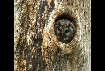 Photo : Surprise avant-hier, la chouette de Tengmalm en train d'observer des ornithologues à l'oeil nu. Merci à Yves pour sa photo et éternelle reconnaissance aux Lumix.