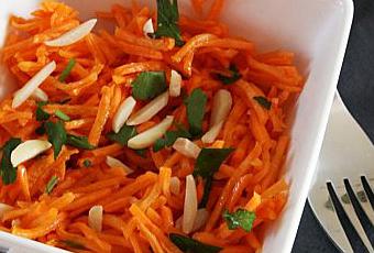 Râper les carottes, ajouter les amandes en bâtonnets et le persil plat, bien mélanger.