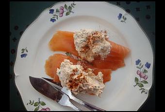 Déposer une grosse noix de ce mélange sur les tranches de saumon fumé. Préparer au dernier moment des tranches de pain complet grillé pour l'accompagnement.