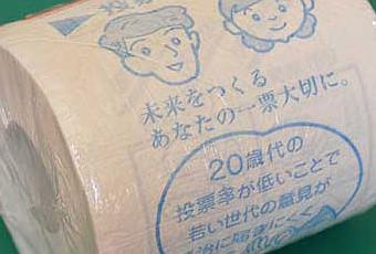 Preparing a fairly modest 200 rolls, the city’s election organizers has been distributing the toilet paper to Odawara restaurants, along with posters and special drinks coasters..”