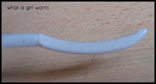 Alors comment ça se présente et comment qu'on s'en sert? En fait c'est tout simplement comme un mascara incurvé, sans poils (sorry pour celui de chat qui traine sur la photo...). Il s'applique exactement comme un mascara, en passant d'abord sur la base des cils avec le bout, puis avec toute la largueur de l'outil, de la base vers la pointe. Moi je le fais même par dessus et par dessous, et j'insiste bien sur le coin externe, et sur les cils du bas aussi. Je suis un peu maniaque du cil quoi.