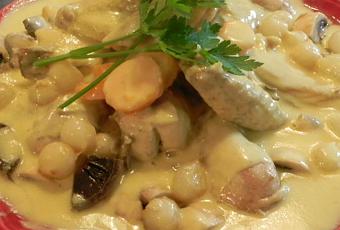De plus, cette recette m'a permis de découvrir de nouvelles techniques : cuisson des champignons frais, des oignons grelots, confection d'une sauce blanche liée à l'oeuf, dépouillement de la sauce...