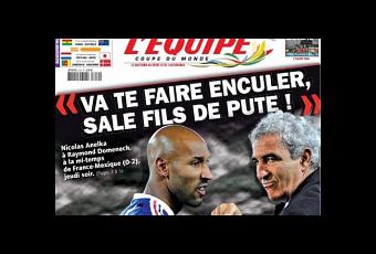 "Vas te faire enculer, sale fils de pute" . Ah comme c'est joli cette spontanéité virile. Combien d'entre nous n'ont-ils pas rêver de sortir ça au chefaillon de sa boîte. Allez , z'y va Anelka , laisses parler ta vraie nature , éloignez les gosses du kiosque. Saluons également tout le tacte du quotidien qui n'a pas hésité une seule seconde à titrer dans la dentelle après son fameux titre de la veille "Les imposteurs" Raymond Domenech , l'a échappé belle , il aurait pu aussi se prendre aussi un coup de boule à la Zizou.