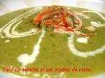 Au moment de servir, déposez le velouté très chaud au milieu de l'assiette , ajoutez un peu de lait de coco, les miettes de crabe et une pincée de cumin, parsemez de coriandre fraîche. Servir.