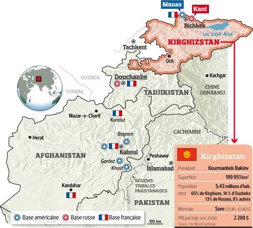 Source : Mickaël Aubout, 2008, "Le réseau des bases aériennes servant auxopérations en Afghanistan", Air & Space Power Journal, vol. IV, n°3, pp. 73-76.Par sa proximité géographique et par son enclavement (et de fait son fort besoin de nouer des relations diplomatiques), la position du Kirghizistan a été mise en exergue dans les installations de bases militaires états-uniennes en Asie centrale. La base militaire de Manas (analysée en détail dans un mémoire de géographie écrit par Mickaël Aubout, Géographie militaire de la base de Manas (Ganci air base) au Kirghizstan : les interactions entre une base militaire et son environnement, soutenu en 2004 à l'Université Paris-Sorbonne) témoigne de l'importance prise par la position du Kirghizistan dans les relations internationales, et des rivalités de pouvoir entre Etats-Unis et Russie qui se jouent pour obtenir le leadership de la région centrasiatique, par-delà le seul intérêt opérationnel. "S'agissant des bases [aériennes] à l'étranger, leur répartition se fait en adéquation avec des zones stratégiques. L'intérêt d'une base hors du territoire national est multiple. Outre une mise en oeuvre rapide de forces militaires aériennes et terrestres, elle permet à une nation de marquer sa zone d'influence. Aujourd'hui, Washington et Moscou s'opposent en Asie par le biais d'un jeu d'implantation et de retrait de leurs bases aériennes respectives. En 2002, les Américains installaient une base sur l'aéroport de Manas au Kirghizistan ; huit mois plus tard, les Russes s'établissaient à leur tour sur l'aéroport de Kant à cent kilomètres de Manas. Les bases aériennes à l'étranger constituent donc des instruments géopolitiques pour les nations" (Mickaël Aubout, "Géographie des bases aériennes", dans Paul-David Régnier, 2008, Dictionnaire de géographie militaire, CNRS Editions, Paris, pp. 74-79).
