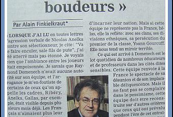 Alain Finkielkraut, lui, s’avance sur le terrain de la culpabilisation et circonscrit le problème autour des seules personnes que sont Domenech l’entraîneur («sans style et sans âme») et les joueurs («sales gosses boudeurs» pleins d’ «arrogance j’men foutiste»). Comme à son habitude droitière, le Monsieur oublie de citer ces absents de marque dans sa démonstration que sont les cadres dirigeants, le Président de la Fédération et les Ministres qui ont donné l’aval à tout ça. Rappelons ici pour les footeux le capital de connaissance sportive de Rama Yade : en interview, elle parlait des phases éliminatoires 1998 pour la France, qui, pays organisateur était qualifié d’office ! Dans son article, ce sont pourtant les seuls joueurs que Finkielkraut qualifie d’ «inintelligents».