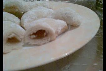 * mettre un peu de confiture sur chaque rondelle puis plier et bien fermer pour obtenir un petit croissant