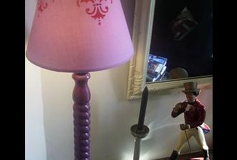 Pied en bois tourné peint aubergine satiné, Abat-jour customisé avec galon rouge ancien et pochoirs, Système éléctrique neuf, fils et interrupteur transparents, douille E27