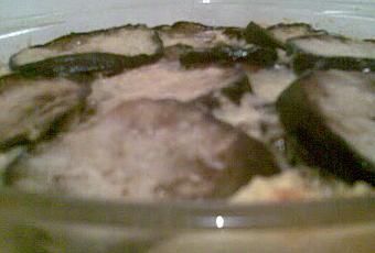 * Beurrer un plat allant au four. Poser une couche d'aubergines au fond, couvrir avec la viande et disposer une autre couche d'aubergines. Battre les œufs avec le lait et la moitié du fromage.