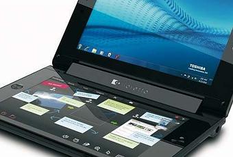 Pour son 25e anniversaire, la division informatique de Toshiba va annoncer la sortie prochaine d’un nouvel ordinateur portable qui a de quoi étonner. En effet, le modèle Toshiba Libretto W100 est un ordinateur disposant de deux écrans tactiles articulés et orientables. Ils mesurent chacun 7 pouces soit 18 cm affichant une résolution de 1024x800 pixels.