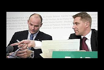 Ecoeuré des pressions exercées sur lui par des collègues de son parti, l'UDC Yvan Perrin [à gauche sur la photo ci-dessus, qui provient d'ici] a annoncé vendredi dernier, et confirmé hier, qu'il démissionnerait prochainement de son poste de Vice-Président du parti. Mais il ne démissionnera pas tant que ne lui aura pas été trouvé un successeur ici :