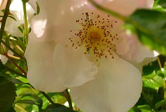 J'avais acheté ce rosier grimpant il y a deux ans et il était chétif et peu généreux mais cette année, il explose... J'adore ces fleurs simples avec beaucoup d'étamines au coeur de la plante. Dommage qu'il ne soit pas très parfumé... J'en profite pour appeler solennellement tous les rosiéristes de la terre à ne plus inventer de roses sans parfum. C'est quand même crétin de créer de nouvelles roses qui ne remplissent qu'à moitié leur destin de fleur. En ettendant profitez des roses , c'est leur année .