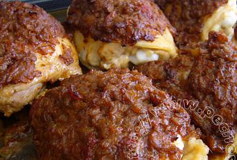 Dans une casserole moyenne, faites fondre le beurre. Ajoutez l’oignon et l’ail, faites cuire en remuant jusqu’à ce que l’oignon soit tendre. Ajoutez les sauces, la moutarde, le chutney, la poudre quatre épices, le sel et le poivre. Mélangez bien, couvrez et laissez cuire 5 minutes à feu doux. Préchauffez le four à 180°C. Disposez le poulet dans un plat à rôtir, côté peau vers le haut. Versez la sauce sur le poulet en veillant à bien le recouvrir. Faites cuire 45 minutes au four en arrosant le poulet avec le jus à mi cuisson.