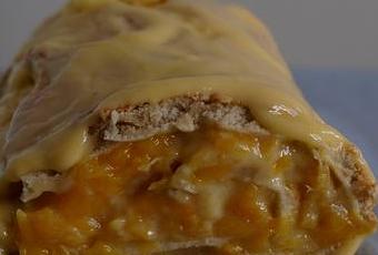 Et c'est maintenant que je parle d'un troisième produit envoyé par Mon fournil : la crème pâtissière en tétra-brick UHT (sans conservateurs). Toute seule, c'est pas très expressif, on va dire, mais avec la compote de pêche, c'est quelque chose ! J'en ai mis environ 400g avec ma compote.