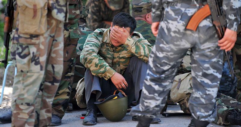 Lundi 21 juin, instant de répit pour ce soldat, membre d'une unité spéciale lors d’une patrouille dans les rues d'Och, dans le sud du Kirghizistan, plus d’une semaine après le début de tensions