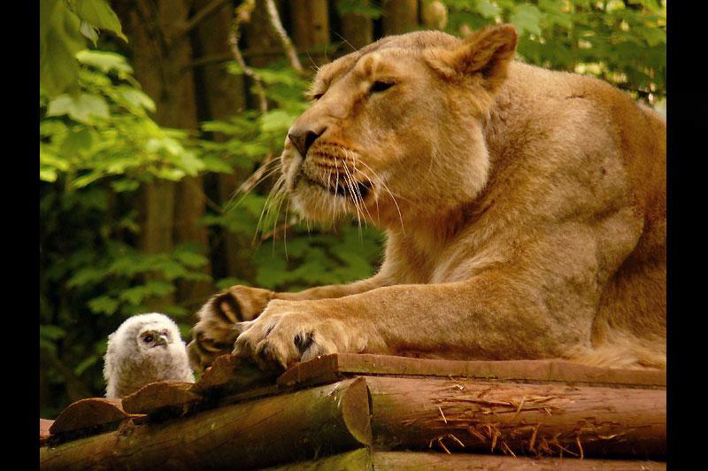 Ce nouveau né hibou observe avec grande attention cette lionne en pleine séance de repos dans le