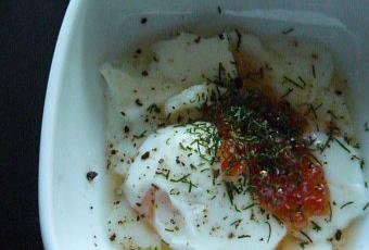 Mardi soir, un savoureux oeuf poché agrémenté de quelques oeufs de saumon et d'un peu d'aneth : c'était moelleux, onctueux, goûteux. Pour l'accompagner, il y avait de la salade verte, un peu de salade de pommes de terre à la ciboulette, une herbe qui rehaussait très agréablement leur saveur, un peu de concombre à la crème avec des herbes mixtes. Tout cela a fourni une variété bien agréable et cela aurait été beaucoup plus triste sans ces herbes.