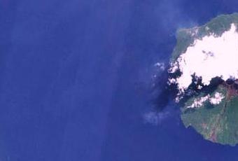 Mais, le 16 Juin 2010, un panache s'échappe du cratère sommital du Manam et reste groupé, sous forme de nuage composé principalement de vapeur d'eau et de gaz, probablement du gaz carbonique, du méthane et de l'anhydride sulfureux, au sommet du dôme avant de s'étendre, tel un voile bleu-gris, vers le Nord-Ouest et, légèrement plus foncé, vers l'Ouest-Nord-Ouest, sur la Mer de Bismarck.