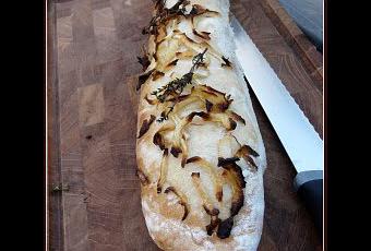 Divisez la pâte en 2 morceaux , farinez les et façonnez les en baguettes . Enrobez les des oignons . Laissez les baguettes doubler de volumes .Faites cuire 15 minutes à 180 °C.