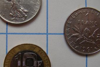 Des pièces, oui, mais pas des Euros… des Francs ! Une pièce de 10 F et 2 pièces de 1 F = 12 F ! Hein, c’est quoi des Francs ? C’est la monnaie qui circulait en France avant le 1er janvier 2002 et 1€ = 6,55957 F.