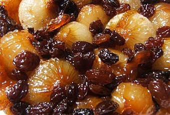 Dans une poêle faites fondre le beurre puis y verser le miel et les oignons et laissez cuire à feu doux/moyen pendant 25 mn, en le retournant régulièrement et délicatement ils doivent êtres bien dorés limite confits , ajoutez les raisins secs salez très légèrement bien mélanger ; laissez 1 à 2 mn puis retirez du feu