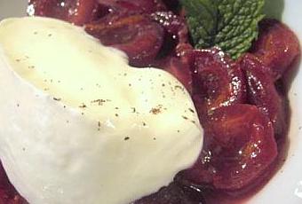 * Mettre les cerises froides et leur jus dans des assiettes creuses et former une quenelle de crème de yaourt et fromage à l'aide de deux cuillères que l'on dispose sur les cerises. Saupoudrer un peu de poudre de vanille (facultatif)