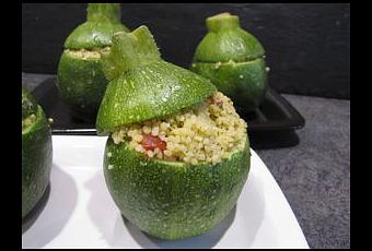 Préparez le taboulé : Coupez les tomates, le concombre et la féta en petits cubes. Assaisonnez et ajoutez les légumes, la féta, la menthe ciselée dans la semoule. J'ai également rajouté des épices pour relever le taboulé. Remplissez les courgettes de taboulé, et n'oubliez pas de remettre le petit chapeau.