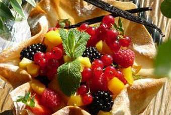 - garnissez les feuilles de brick de 2 c à s de mangue, puis déposez les fruits rouges dans l’ordre qu’il vous plaira (émincez les fraises avec leur queues). Jouez avec la couleur et finissez par une dernière cuillère de mangue.