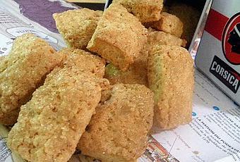 Vous avez peu de temps , peu d'ingrédients sous la main et une envie de douceur! allumez le four et en 10mn chrono de préparation et 20mn de cuisson bref le temps de dire Canestrelli....Un petit gâteau étonnant à base de Pastis croustillant sur le dessus et moelleux en dedans, qui sent bon le soleil de Corse et qui se garde plusieurs semaines dans une boite hermétique , merci à Victor qui m'a gentiment donné sa recette que j'ai bien sûr emportée dans ma valise et classée dans mes souvenirs de vacances .Ingrédients:-500g de farine-125g de sucre-1sachet de levure-12,5cl de vin blanc -5cl de Pastis-un peu de sucre cristallisé ou de sucre roux-12,5cl d'huile (arachide, pépins de raisin)Passer au tamis la farine , la levure , le sucre. Ajouter le vin blanc et le pastis. mélanger avec les mains , cela donne une pâte grumeleuse. ajouter la moitié de l'huile et continuer de mélanger puis ajouter progressivement le reste de l'huile jusqu'à obtenir une pâte sèche comme de la pâte à sel ou une pâte brisée bien sèche.Étaler au rouleau sur 1cm d'épaisseur (ça ne doit pas coller au doigts)et asperger d'un peu d'eau (pour faire tenir le sucre sur le dessus du gâteau) puis saupoudrer de sucre roux ou cristallisé.Couper des rectangles, et enfourner dans un four chaud 180° ventillé pendant 20mn (le dessus doit être doré) Après on peu décliner ce petit gâteau en y ajoutant des amandes , du citron, et des graines d'anis.