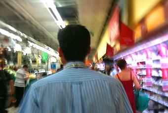 Droit devant. Chemise trop large rentrée dans un jean’s trop serré. La houppette bien gominée qui pointe droit vers les néons du magasin. Le tour de cou estampillé de l’enseigne qui se balance de droite à gauche. Portable et trousseau de clés, qui pendouillent, marquent la cadence.