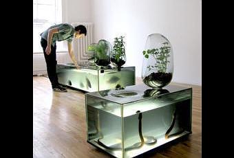 Aujourd’hui, le design ne peut ignorer les questions d’écologie actuelles. Il est désormais possible, d’implanter une « rivière urbaine » au cœur de son salon, avec poissons et plantes aquatiques… Mathieu Lehanneur se différencie principalement des autres designers pour l’intérêt qu’il porte à la science. Il aime combiner la haute technologie et la nature pour en faire des créations uniques. Ce projet de rivière locale s’inspire des locavores de San Fransisco, une population qui se nourrit exclusivement de produits locaux, réduisant ainsi l’impact du transport sur l’environnement et conservant la fraîcheur des produits. Les plantes qui, par ce procédé, poussent sur l’eau permettent de purifier l’eau des nitrates et autres minéraux produits par les déjections des poissons. «Rien ne se perd tout se transforme», un cycle naturel recomposé chez vous ! C’est un exemple un peu extrême, d’une réponses qu’un designer peut proposer. De nombreux salons d’expositions incitent les designers à travailler dans cette direction. Mais depuis quelques années, chaque créateur participe aussi, en choisissant, déjà des matériaux recyclables ou en favorisant les entreprises locales… On avance vers des objets plus saints pour notre environnement ! Un bel aquarium et de jolies plantes, cela ne vous séduit pas?