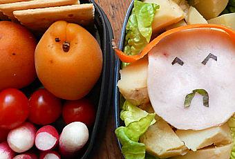 Pour grignoter ce soir, des radis et des tomates cerises qui accompagnent une salade de pommes de terre et un petit personnage ronchon de blanc de poulet.
