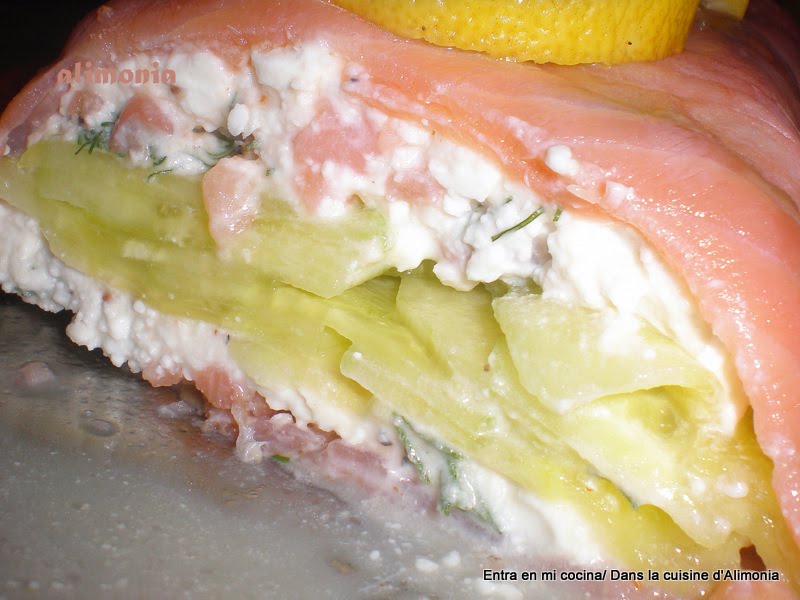 Rellenar con la mitad de la preparacion de queso, cubrir con las lonchas de pepinos.