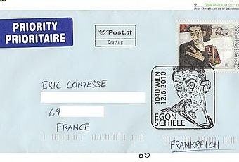 Merci beaucoup Edna pour ce très réussi pli "1er jour" ci-dessus concernant ce timbre :-)La mise en vente "1er jour" de ce timbre avait lieu le 12 juin dernier au musée historique de Vienne où est exposée l'oeuvre reproduite sur ce timbre : "Autoportrait avec récipient noir en terre cuite et aux doigts écartés" (1911).