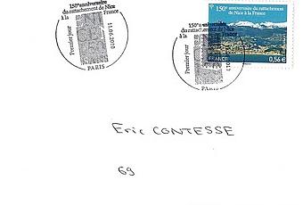 Le timbre à date "1er jour", différent de celui émis en mars pour le timbre consacré au rattachement de la Savoie (sur lequel figurait pourtant une allégorie de Nice...), reproduit le logo officiel du 150ème anniversaire du rattachement de Nice à la France.