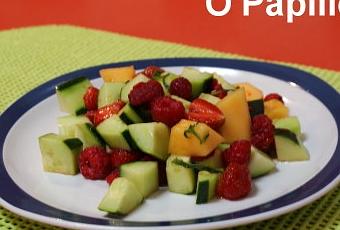 Il faut prévoir 1 concombre, quelques framboises et fraises, 1 melon, 3 cuillères à soupe d'huile de colza, 2 cuillères à soupe de vinaigre de cidre, 2 cuillères à soupe de grenache noir de Rivesaltes ou de porto, quelques feuilles de menthe, sel et poivre.