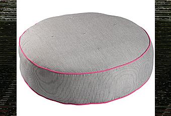 Coussin de sol rond gris clair/rose LEON. Diamètre 60 sur épaisseur 15cm. Extérieur 100% coton.