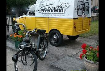 << Le propriétaire de la 2cv n'est pas l'illustrateur comme indiqué sur la photo, il a acheté le véhicule de cette société et préfère laisser tout en l'état. C'est un maniaque, je l'ai aperçu depuis le pas du restaurant où je fumais (! ndlr) lors de ma prestation près de Thionville, un gars poussait une mobylette pour la faire démarrer, je me suis approchée, et j'ai vu la magnifique 2cv, on a parlé et il m'a sorti un solex presque neuf... déballé du papier à bulles qui l'entourait ! sympa le gars. La mobylette... j'ai oublié de la prendre en photo. >> (: ))