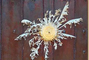 On la voit sur les portes des maisons caussenardes ou cévenoles. Celle qui illustre cette note étalait ses pétales secs dans un minuscule village des gorges du Tarn. Il s’agit d’un chardon particulier, adapté au calcaire des Causses, qui fut autrefois en partie mangé comme un artichaut, les deux plantes étant de la même famille.
