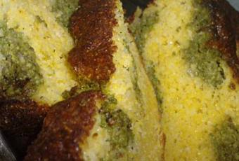 Battre 3 œufs en omelette à la fourchette. Y incorporer 180g de polenta, 1 sachet de levure, du parmesan, 4 petits suisses natures, 2CS d'huile d'olive, 30cl de lait, 2CS de farine, du sel et du poivre