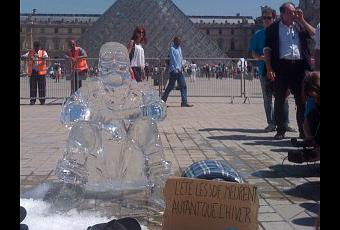 Parce que l’été, les centres d’hébergement ferment leurs portes, et parce que 406 personnes ont trouvé la mort en 2009 dans la rue, la Fondation Abbé Pierre et l’agence BDDP Unlimited ont voulu sensibiliser les passants aux risques encourus par les sans-abri sous ces chaleurs caniculaires. Une statue de glace a donc été placée en plein soleil devant la pyramide du Louvre, représentant ainsi cette image très symbolique de la disparition d’une personne à la vue et au su de tous.