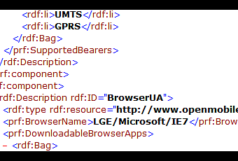 Comme vous pouvez voir sur le code XML du navigateur LG, présent ci-dessus, le navigateur utilisé est IE7 de Microsoft, ce qui révèle donc l’arrivée de deux nouveaux téléphones qui seront, le LG E900 et C900 et qui supporteront le GSM et le HSDPA.