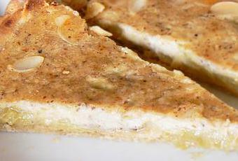 Garniture: compote de rhubarbe parfumée avec de la badiane - 2 cs de noisette en poudre - 1 oeuf - 1 cs de maïzena - 200 ml de lait - 40 g de sucre ou Sweet'line - amandes effilées