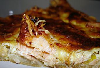 - Parsemez le fond de la tarte avec les poireaux et les échalotes. Ajoutez les pavés de saumon coupés en petits morceaux. Parsemez de persil ciselé.