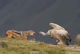 Un chacal et un vautour combattent pour un morceau de carcasse animale.