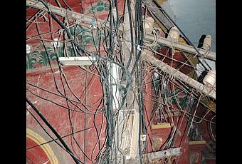 Lors de notre passage en 2004, des monceaux de pierres longent encore les rues, et le réseau électrique n'a pas été vraiment rétabli. Aussi, c'est le système D qui prime, comme le montre cette photo.