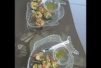 Chauffer le BBQ à feu vif. Badigeonner les crevettes d'un peu d'huile de la marinade. Griller environ 5 minutes de chaque côté (pas trop longtemps elles deviendraient caoutchouteuse). Déposer les ingrédients solides en quantité sur les crevettes après les avoir retournées du deuxième côté. Déposer dans de petites assiettes et servir accompagné de Gelée de piments jalapenos Épicure Sélections, en guise de sauce trempette. Un véritable délice ou un petit bonheur d'été! Des petites brochettes qui vous feront attendre le souper avec gaiété! Peu importe que vous soupiez quand il fait soleil ou légèrement plus tard, comme moi.