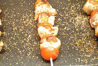 Mettez vos brochettes sur la plancha , salez , poivrez et ajoutez les herbes de Provence , faite cuire le premier coté . Retournez-les et idem , sel ….poivre ….etc.....