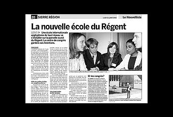 REVUE DE PRESSE - Une école internationale anglophone de haut niveau va s’installer sur la parcelle ouest du Régent, annonçait lundi Le Nouvelliste. Et de préciser que le centre de congrès gardera ses fonctions. Un projet estimé à 40 millions de francs, avec la construction de trois bâtiments dans un premier temps sur les 13'500 m2 mis à disposition par la Commune de Lens (DDP). Sous réserve d'approbation de l'assemblée primaire évidemment. Retrouvez ci-après l’article de France Massy. L’assemblée primaire du 21 juin a accepté - à une large majorité - la proposition de modification du PAD (Plan aménagement détaillé) concernant la zone du Régent. Une modification qui avait pourtant fait couler beaucoup d’encre (NF du 25 mai) et provoqué l’annulation du Jumping Horse Show par ses organisateurs (NF du 28 mai et du 2 juin). Au vu du projet qui s’annonce, l'abrogation du Jumping risque de devenir très vite un simple mauvais souvenir pour les commerçants du Haut-Plateau. «L’implantation d’une école de cette envergure apportera une plus-value extraordinaire à la station» affirme le président David Bagnoud.