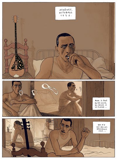 peu connu en Europe mais dont les figures populaires ne manquèrent pas de provoquer des scandales en diffusant leur musique déviante. Ils étaient des poètes, des âmes sombres. Et le rébétiko sonne comme un fado oriental. A voir l'album de prime abord, les traits sombres et les cases aux figures un peu statiques m'ont laissée sceptique. Et puis très vite, les pages tournées ont révélé une histoire inconnue de moi, une ambiance particulière et m'ont appris l'existence de ce mouvement à travers des personnages forts, tragiques, malmenés, ennivrés. Beaucoup d'hommes, et cette femme à demi énigmatique, personnage secondaire mais grand symbole de liberté.Un remarquable travail de documentation que l'on devine en lisant ce que l'on prendrait pour une pure fiction méditerrannéenne.Les 21 premières planches en noir&blanc - Futuropolis